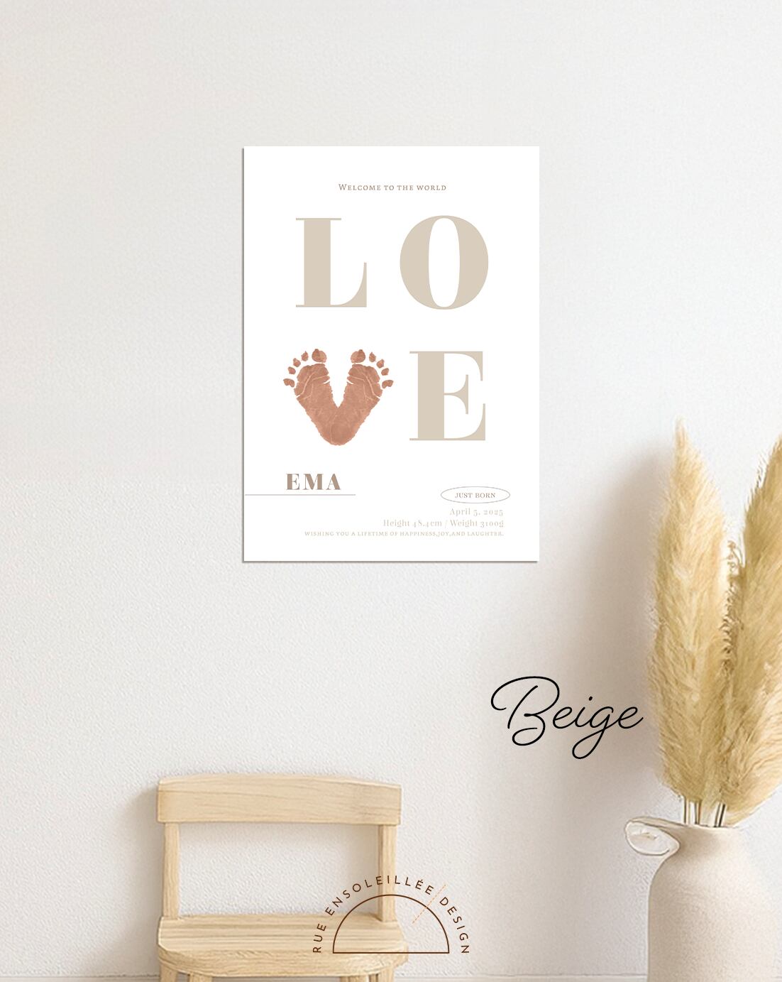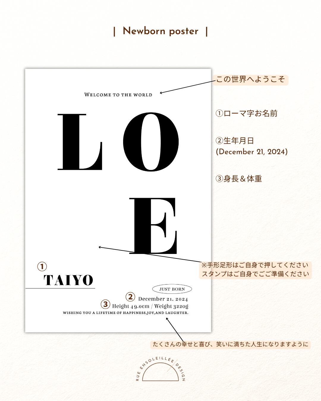 赤ちゃんの「はじめまして」の記録を、足形とともに残せる、LOVEモチーフのニューボーンポスターです。