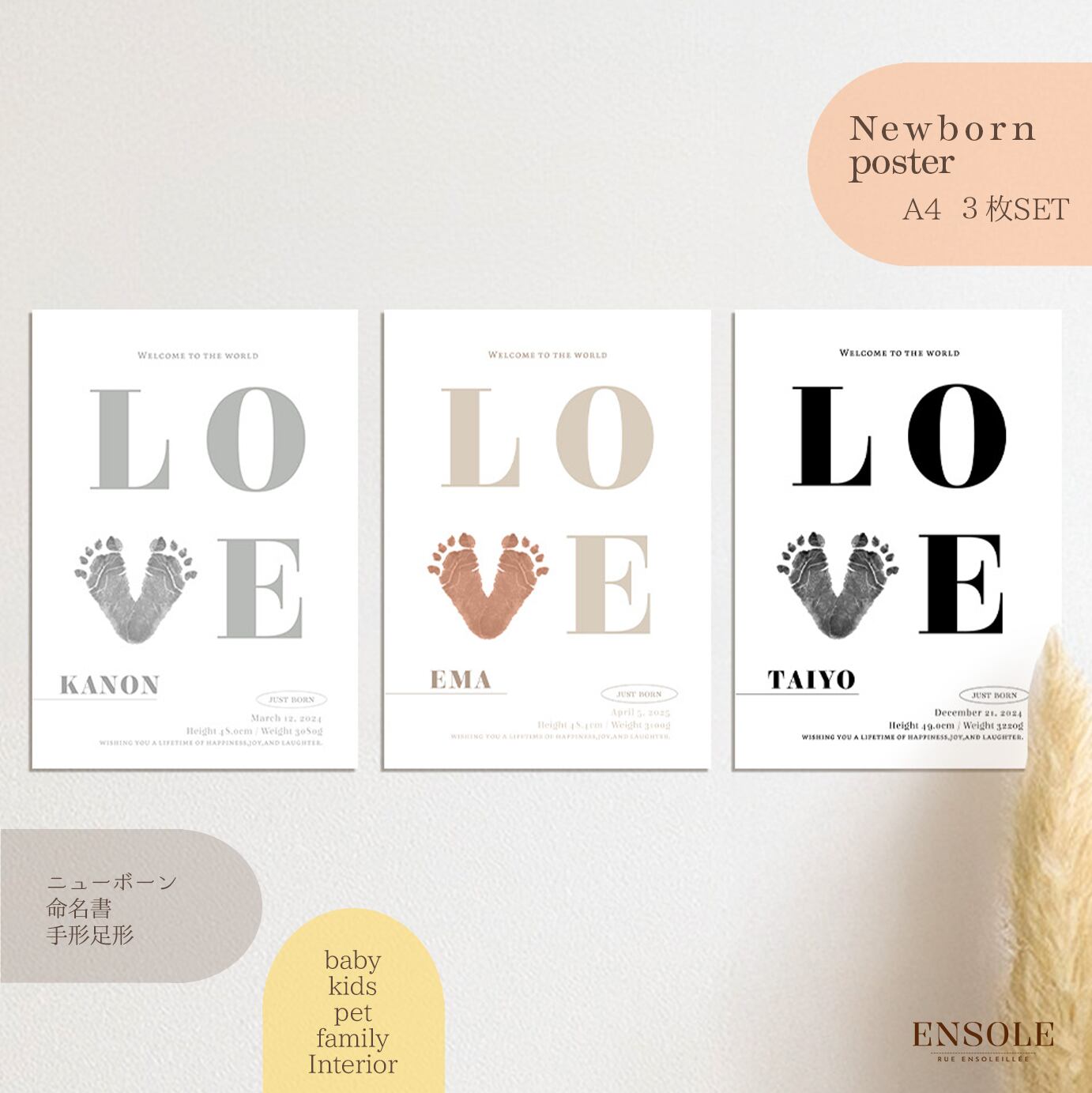 Newborn Poster - 【LOVE-3color】命名書・手形足形ポスター3枚セット